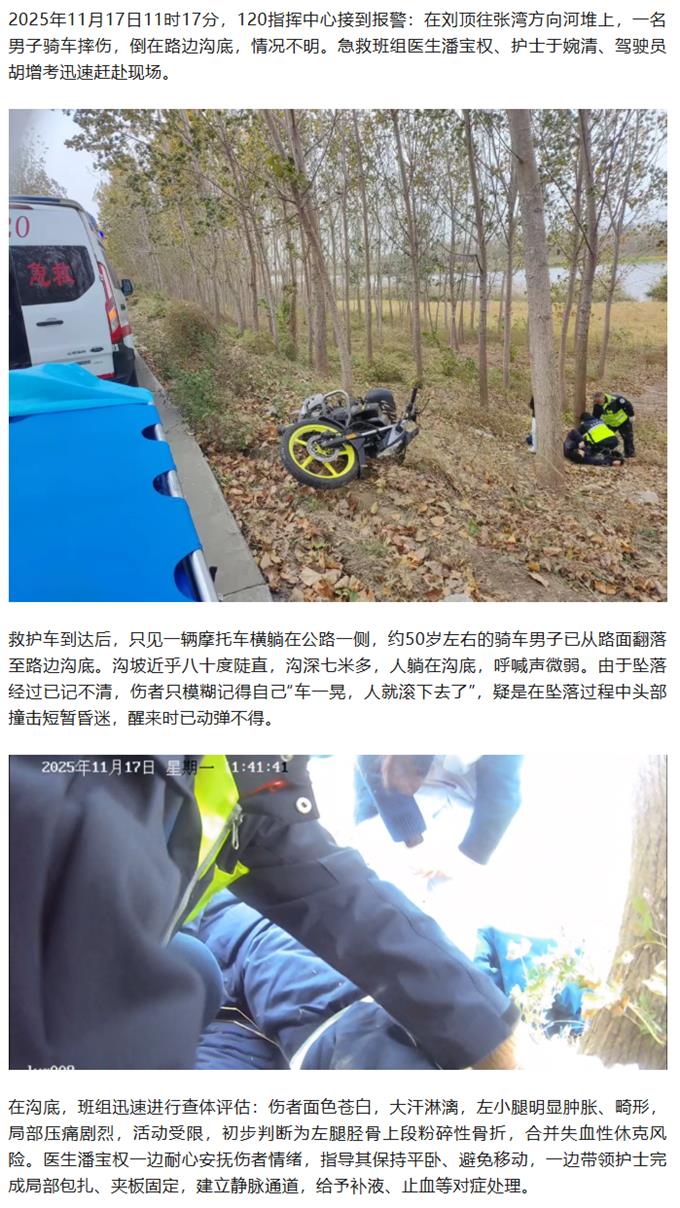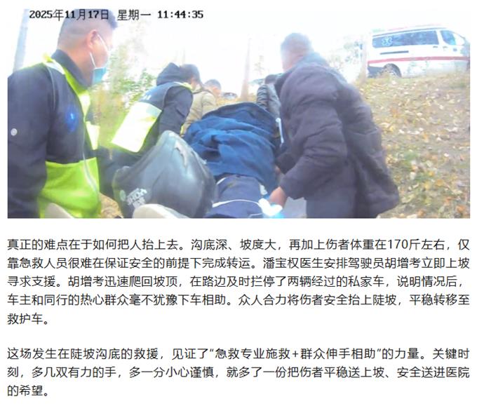 騎車墜落七米深溝,急救溝底固定止血,熱心群眾合力抬人上堤