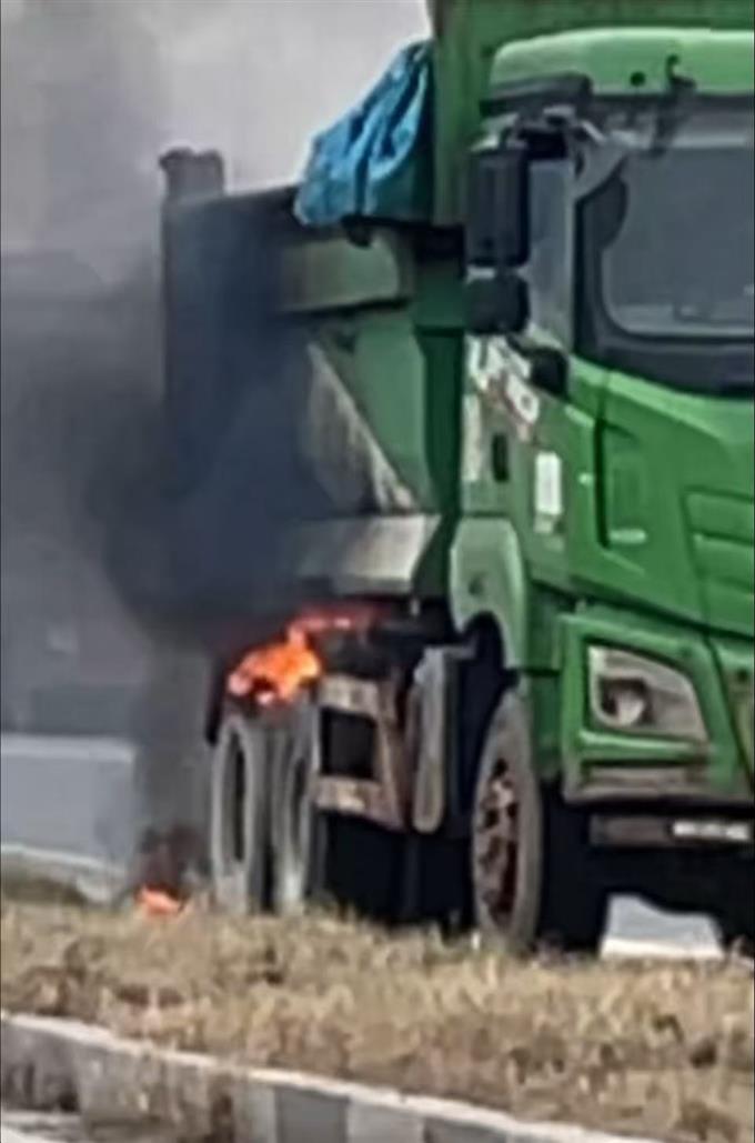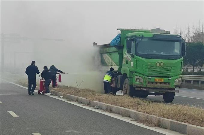 起火車輛為一輛空載重型自卸車,初步了解為車輛線路老化導(dǎo)致后尾燈部位自燃,并進一步引燃后輪胎。由于著火點距離油箱極近,危險系數(shù)顯著升高。為阻斷火勢擴大,急救駕駛員武心浩立即奔向加油站借用手提滅火器和推車式滅火器,三名急救人員按照日常消防演練流程協(xié)同開展滅火操作。在持續(xù)噴射滅火劑并配合隨后趕到的消防力量共同處置下,現(xiàn)場火勢在約15分鐘內(nèi)被完全撲滅,未造成人員傷亡,避免了可能帶來的更大損失。